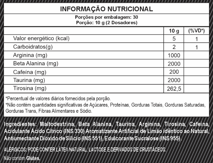 A Beta Alanina atua no aumento da resistência muscular e na redução da fadiga, permitindo treinos mais longos e intensos. A Arginina e a Taurina promovem o famoso pump muscular e melhoram o fluxo sanguíneo, enquanto a Cafeína fornece energia e foco mental. Já a Tirosina auxilia no desempenho cognitivo e na manutenção da concentração sob esforço físico.